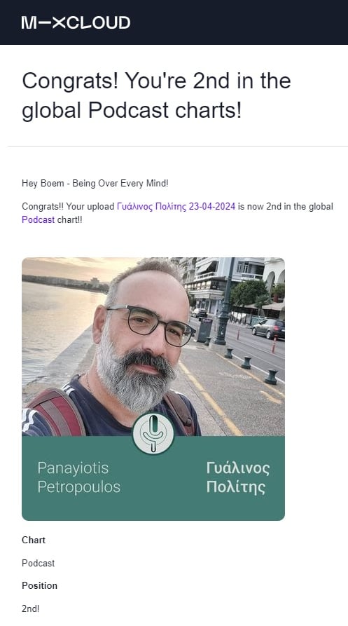 Η εκπομπή του Γυάλινου Πολίτη της Τρίτης 23 Απριλίου κατάφερε να φτάσει μέχρι και την 2η θέση στην κατηγορία podcast της κατάταξης του Mixcloud. Επιπλέον έφτασε 6η στην κατηγορία 1980s, 8η στην κατηγορία oldies και 30η στην κατηγορία pop. Και κάπως έτσι ολοκληρώθηκε ο κύκλος της.