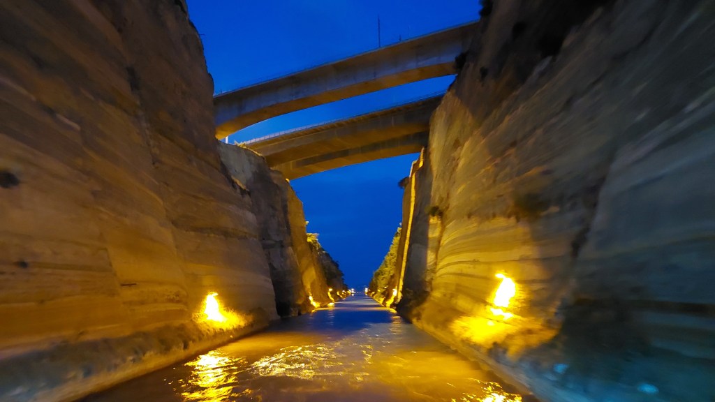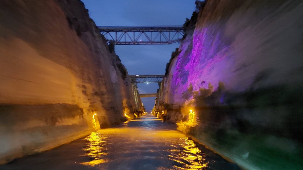 Υπάρχουν πολλά πλοιάρια που κάνουν τον διάπλου της διώρυγας του Ισθμού της Κορίνθου. Εγώ μαζί με την παρέα μου εκείνη την ημέρα αποφασίσαμε να περάσουμε το κανάλι απόγευμα / νύχτα. Τελικά όμως και επί της ουσίας καταλήξαμε να το περάσουμε μόνο νύχτα λόγω του ότι έτυχε την ώρα που ξεκινήσαμε η κατεύθυνση των πλοίων που περνούσαν το κανάλι να είναι προς την αντίθετη κατεύθυνση.