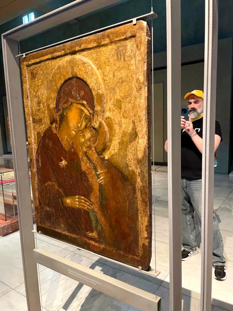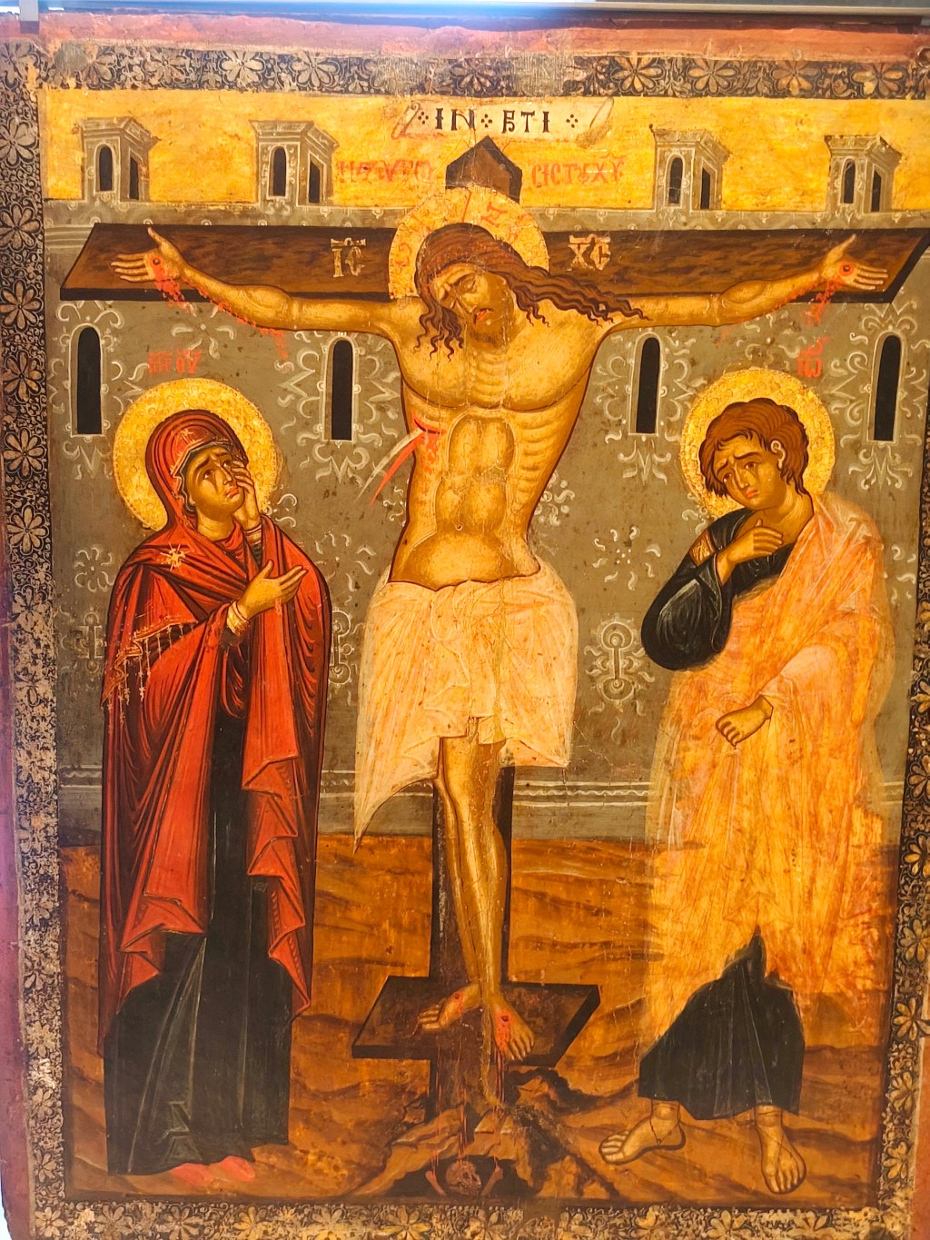 Η συγκεκριμένη εντυπωσιακή αμφιπρόσωπη εικόνα (με τη Σταύρωση στη μία όψη και την Παναγία Γλυκοφιλούσα στην άλλη) προέρχεται από τον Ναό του Αγίου Νικολάου του Ορφανού στη Θεσσαλονίκη. Είναι ένα από τα σημαντικότερα κειμήλια που μεταφέρθηκαν στο Μουσείο Βυζαντινού Πολιτισμού για λόγους προστασίας και συντήρησης.